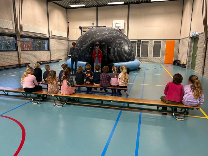 Vandaag stond er een opblaasbare koepel van 3,5 meter hoog en 6 meter doorsnede in onze gymzaal. We kregen bezoek van studenten Sterrenkunde van de Rijksuniversiteit Groningen. Zij hadden een mobiel planetarium meegenomen, waar elke groep een bezoek aan mocht brengen.
